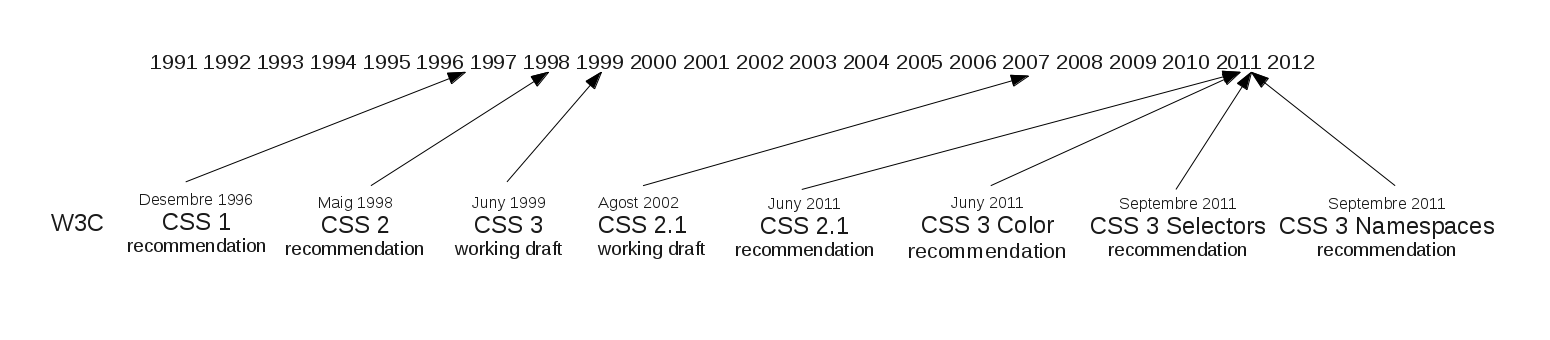 Com podeu observar a partir de la versió CSS3, els estàndards es tracten en mòduls per separat, com ara els colors, selectors o namespaces, tal com mostra la figura.