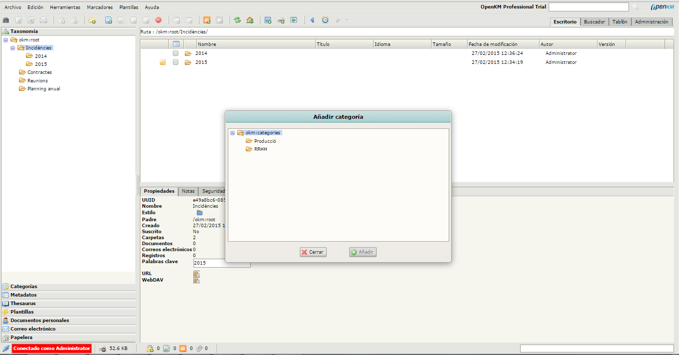 Es recomana utilitzar les dues vies. Hi ha canvis de configuració que exigiran editar directament fitxers i, per altra banda, determinades accions són molt més eficients si es realitzen des d’un entorn gràfic. No cal dir que per dur a terme aquesta tasca tan important és imprescindible que el sistema de fitxers estigui correctament estructurat i l’entorn gràfic sigui descriptiu i intuïtiu; ambdós aspectes són proveïts per OpenKM.