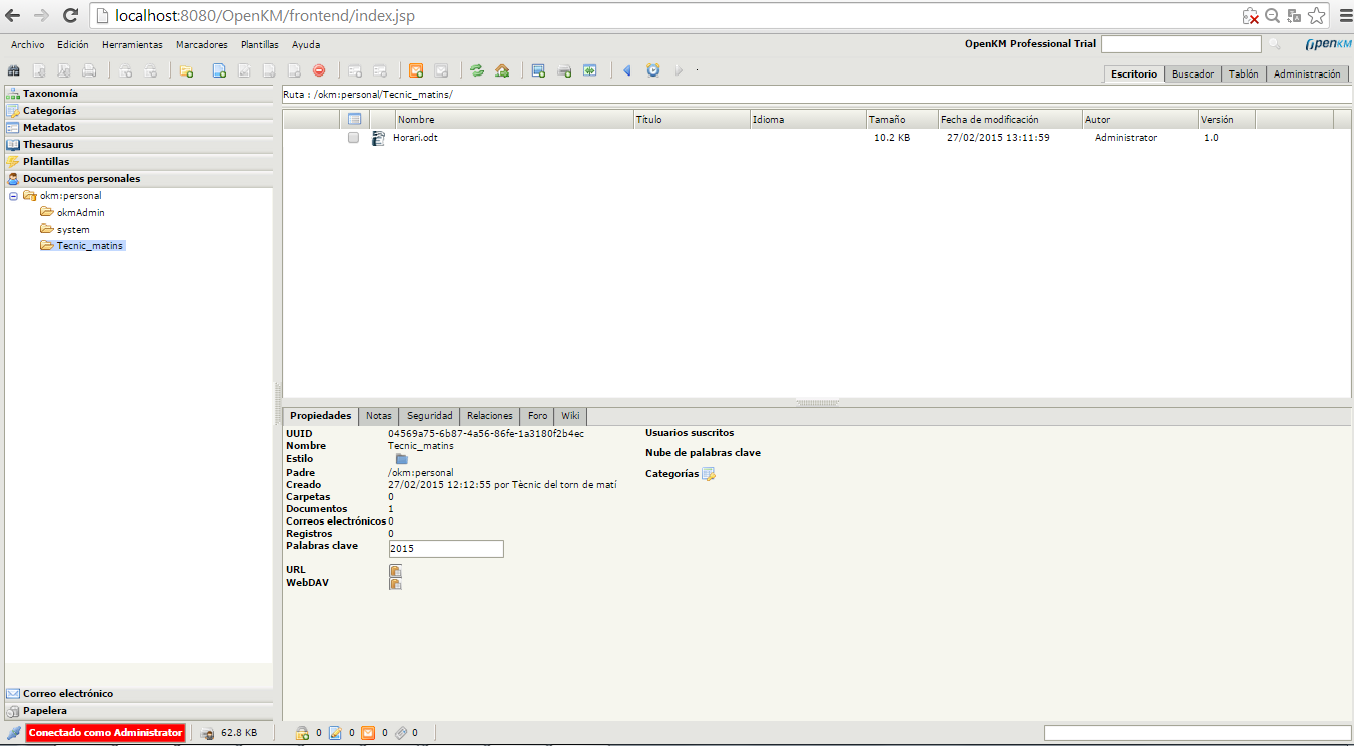 Recordeu que per accedir a l’entorn usuari és imprescindible que primer l’hagi iniciat el servei. Si és la primera vegada que instal·leu OpenKM i no l’heu utilitzat mai heu d’executar al servidor: