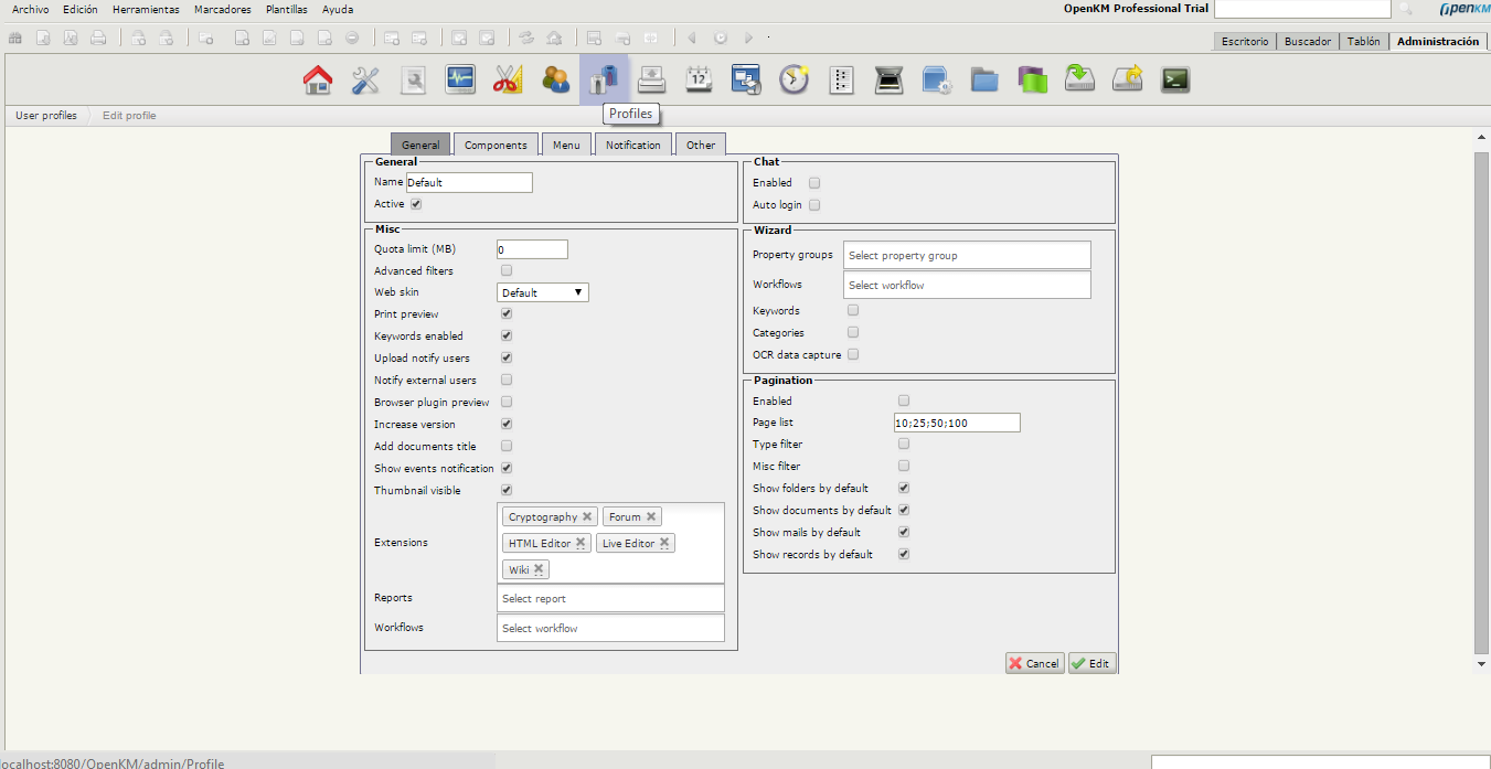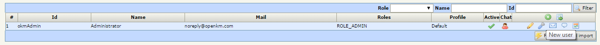 El programa OpenKM treu profit a la gestió de perfils en funció del rol i dels grups de propietat. Per afegir un o diversos rols a un usuari cal utilitzar el procés d’edició de l’usuari i afegir el rol escaient. Si no existeix un rol a mida del que necessiteu podeu crear nous rols.