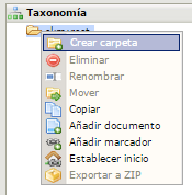 Per mostrar com crear espais personalitzats es pot provar de crear una carpeta des de la Taxonomia (figura). Per realitzar aquesta acció bastarà amb clicar amb el botó dret a sobre d’una carpeta i clicar a l’opció Crear carpeta.