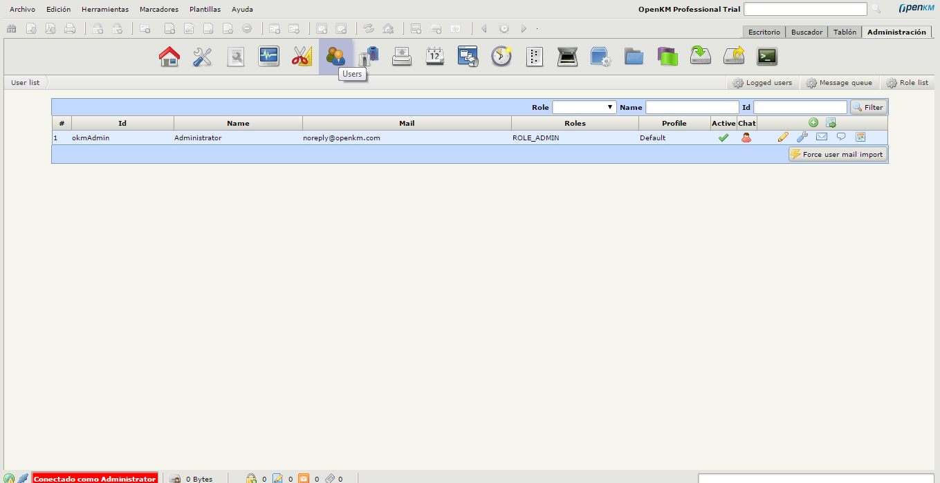 La primera vegada que utilitzeu OpenKm no hi haurà usuaris configurats a part de l’administrador, per tant, per accedir-hi necessiteu les següents dades: