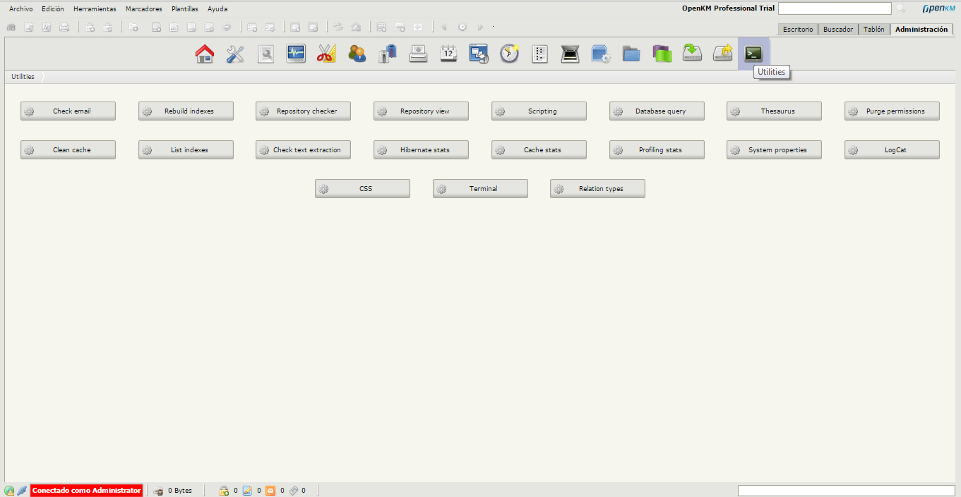 Aquest és l’aspecte que presenta inicialment el perfil d’administrador. L’usuari no administrador no tindrà accés a tot aquest entorn. Totes les accions de configuració que es realitzin sobre aquest entorn gràfic modificaran fitxers de configuració. Si es prefereix, es pot treballar directament sobre els fitxers i no utilitzar l’entorn gràfic d’administració.