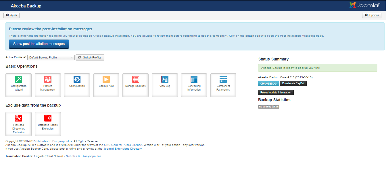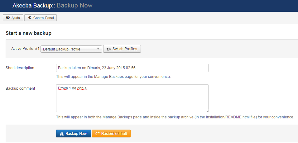 El component de backup Akeeba disposa d’un panell de control (vegeu figura) que permet: