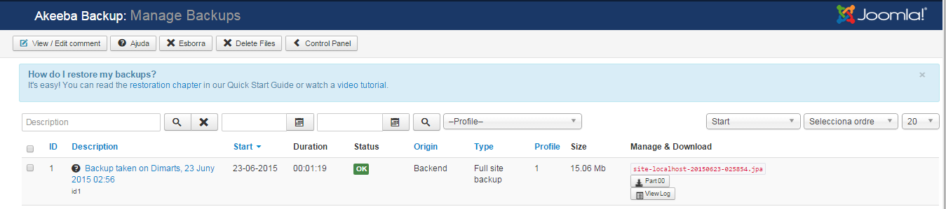 Si torneu al panell de control d’Akeeba i accediu a Akeeba Backup: Manage Backups veureu que apareix la còpia de seguretat acabada de crear (figura).
