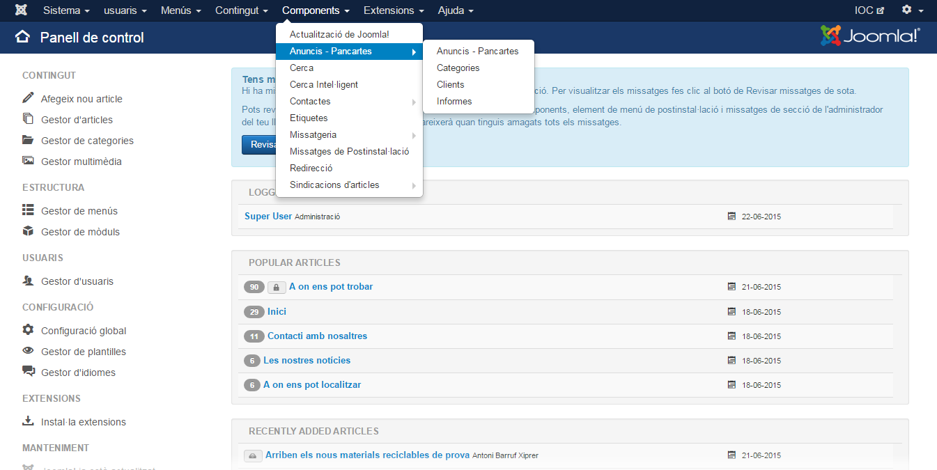 La gestió d’anuncis amb Joomla! es realitza al back-end i cal accedir a Components - Anuncis - Pancartes, tal com mostra la figura.