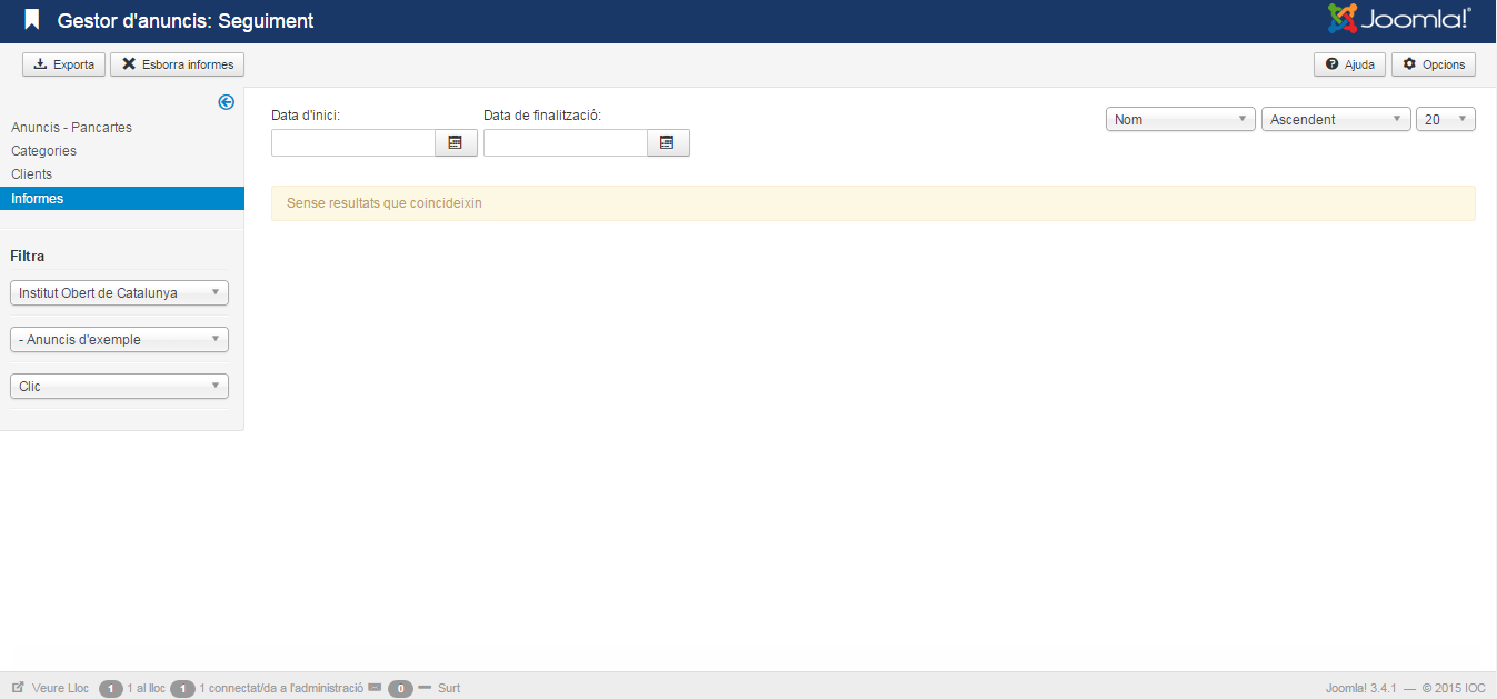 Joomla! permet visualitzar estadístiques del anuncis. Accedint a la pantalla Gestor d’anuncis/Seguiment es pot generar un informe com el de la figura