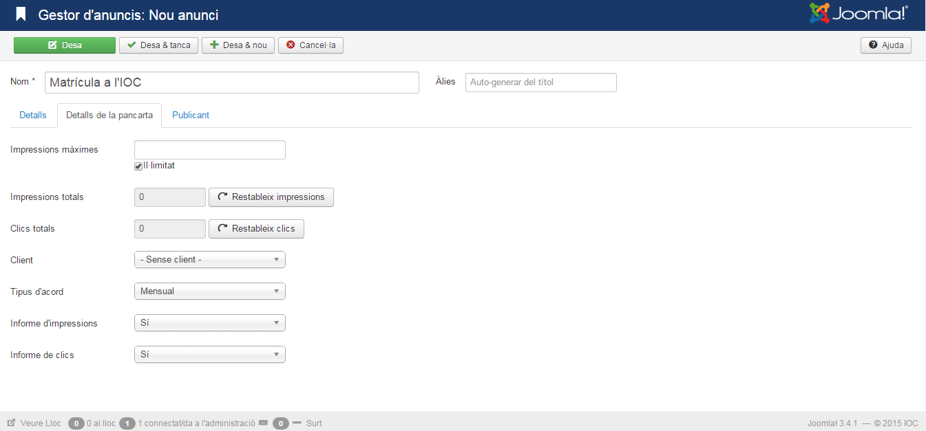 Per crear un anunci nou s’ha d’accedir a Gestor d’anuncis/Anuncis i clicar al botó Nou. Apareix una pantalla identificada Gestor d’anuncis/Nou anunci on es pot indicar el títol del bàner i introduir tota la informació necessària per mitjà de tres fitxes: