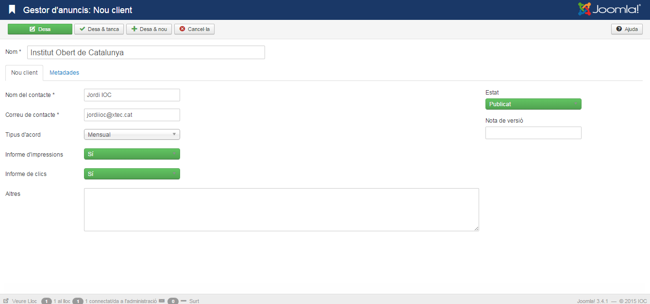 Els anuncis han d’estar vinculats a un client. Per gestionar els clients cal anar a la pantalla Gestor d’anuncis/Clients. Clicant al botó Nou s’accedeix a Gestor d’anuncis/Nou client on és necessari introduir les dades: