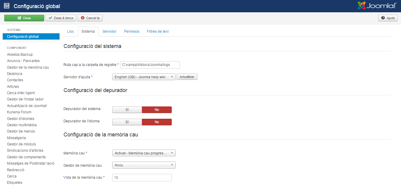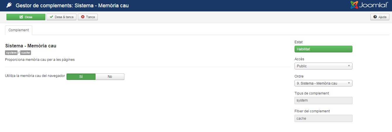 Des de la pantalla Gestor de complements/Sistema - Memòria cau (figura) es pot habilitar i utilitzar la memòria cau del navegador.