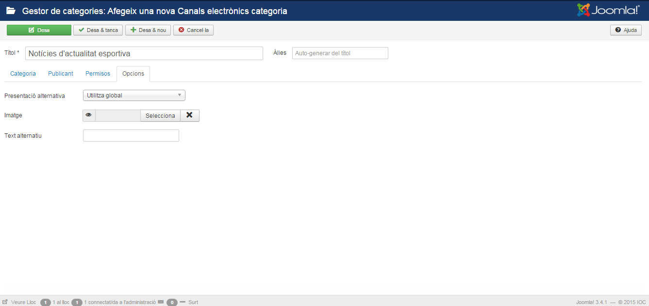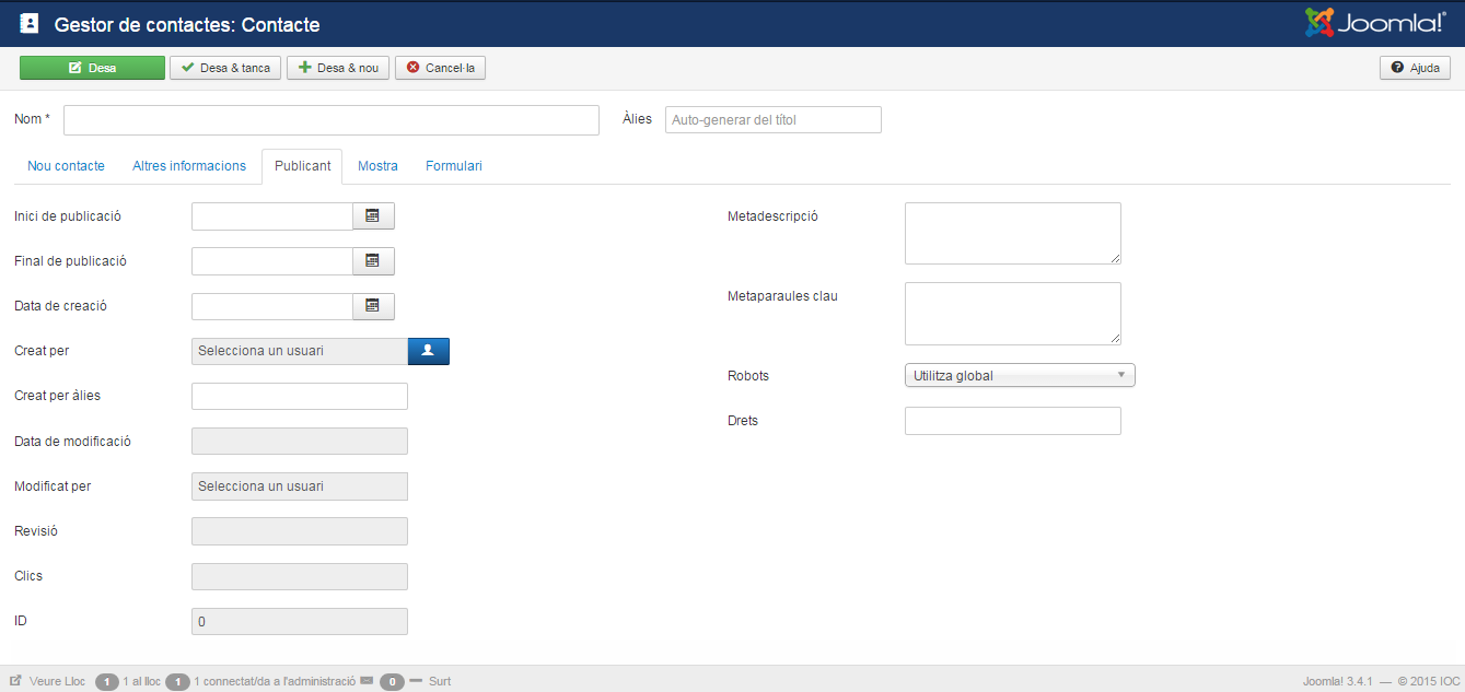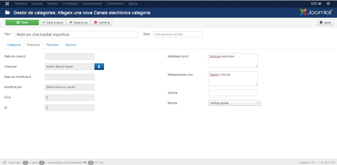 Podeu crear diferents categories on es classificaran els vostres contactes. Per accedir al gestor de categories, feu clic en el menú Components/Contactes/Categories. Veureu una llista de les categories que teniu definides en el lloc web. La primera vegada que entreu, aquesta llista estarà buida. Les columnes de la llista us donen diferent informació sobre les categories. Teniu un filtre de selecció per poder fer un filtratge entre totes les categories si en teniu més de les que es poden veure en una pantalla. A les pestanyes de dalt podeu triar que la llista mostri les categories o bé els contactes. Feu clic al botó Nou de la barra d’eines per crear una nova categoria. Veureu el formulari de creació de categories, aquest formulari és el mateix que es fa servir per crear les categories d’articles, encara que aquí molts dels paràmetres no es fan servir. L’únic paràmetre necessari per introduir és el títol i l’àlies (aquest últim, de la mateixa manera com passa en altres formularis de creació del Joomla!, si el deixeu en blanc el mateix Joomla! l’omplirà per vosaltres).