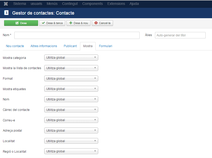 Per accedir al gestor de categories feu clic en el menú Components/Contactes/. Veureu una llista dels contactes que heu creat en el lloc web. La primera vegada que entreu aquesta llista estarà buida. A cada columna de la llista es mostra un dels paràmetres del contacte. Teniu un filtre de selecció per poder filtrar entre els diferents contactes: per categoria, per estat (si està publicat o no) o pel nom. Si feu clic en el botó Paràmetres, podreu escollir la configuració global que s’aplicarà a tots els contactes. Entre les coses que podeu configurar hi ha quins camps dels contactes voleu que es mostrin i si voleu que es mostrin icones juntament amb els camps dels contactes.
