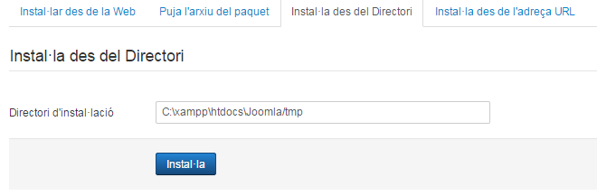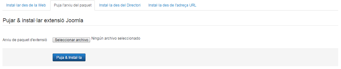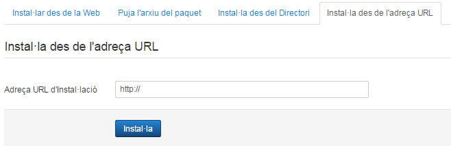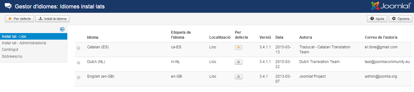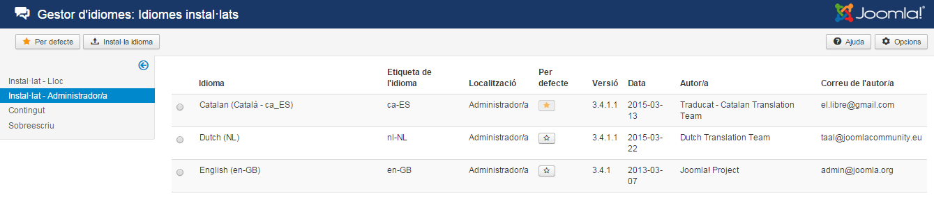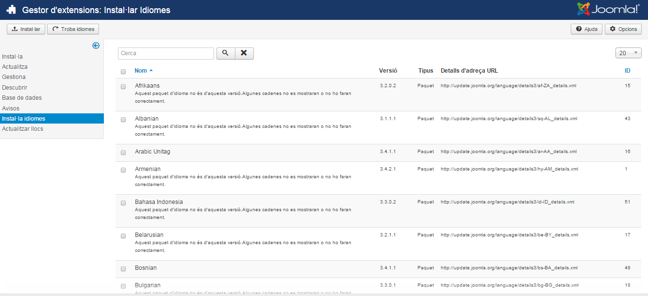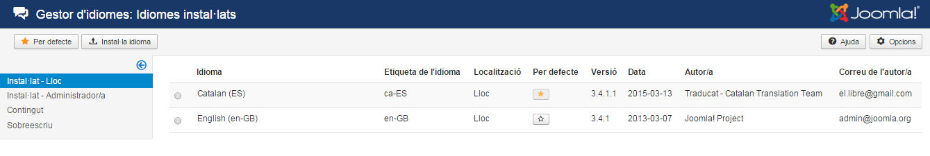 Des de la pantalla Gestor d’idiomes/Idiomes instal·lats es poden instal·lar diferents idiomes per al front-end i per al back-end.