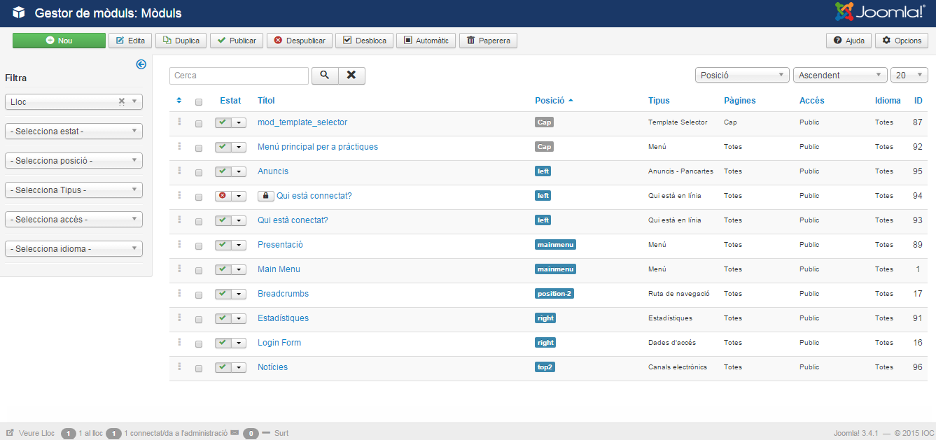 La pantalla Gestor d’anuncis/Anuncis conté les accions necessàries per tractar els bàners. Com podeu comprovar apareixen els mateixos botons que podeu trobar per exemple a la gestió dels articles:
