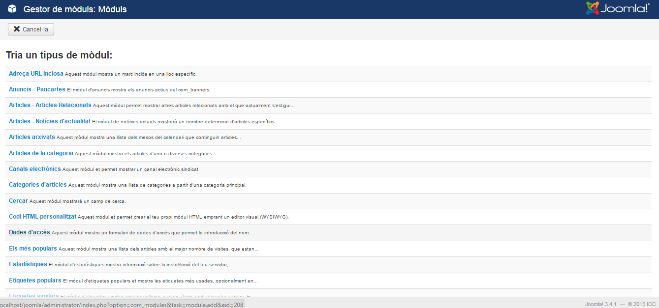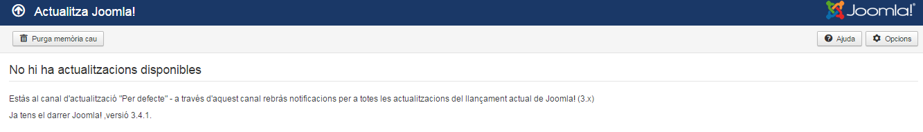 Des del back-end es pot actualitzar Joomla! amb les últimes versions. Si accediu a Actualitza Joomla! us apareixerà la pantalla que teniu a la figura on s’indicaran les últimes actualitzacions disponibles. En el cas d’aquest exemple la versió actual és la 3.4.1 que coincideix amb la instal·lada i, per tant, no es pot actualitzar.