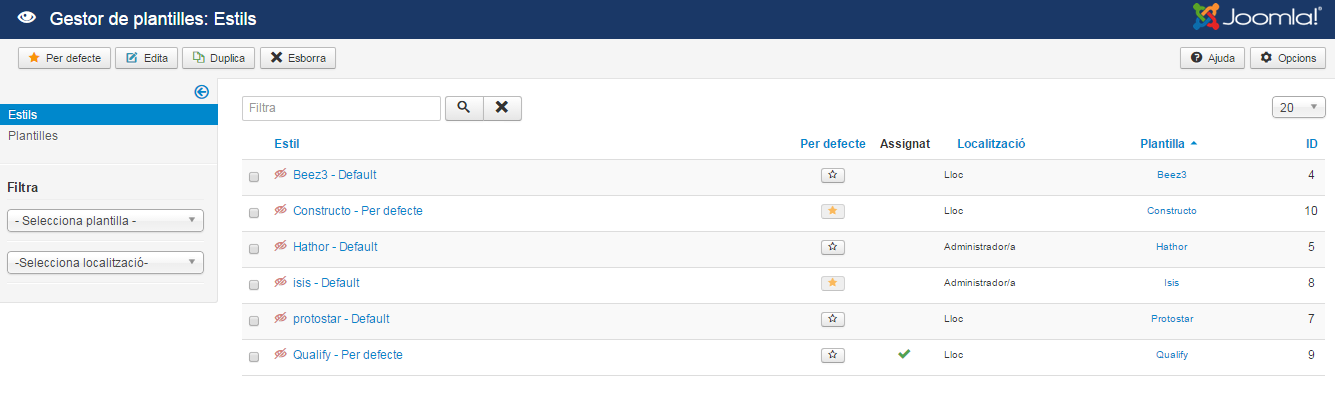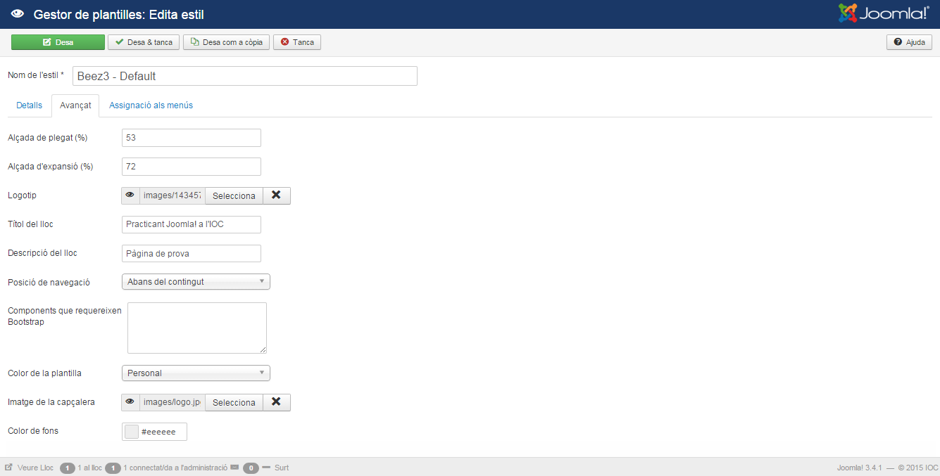 Per editar un estil cal estar a Gestor de plantilles/Estils i clicar a sobre de qualsevol estil. Si per exemple es clica a sobre de l’estil Beez3 - Default es mostra la informació de la figura a la fitxa Avançat: