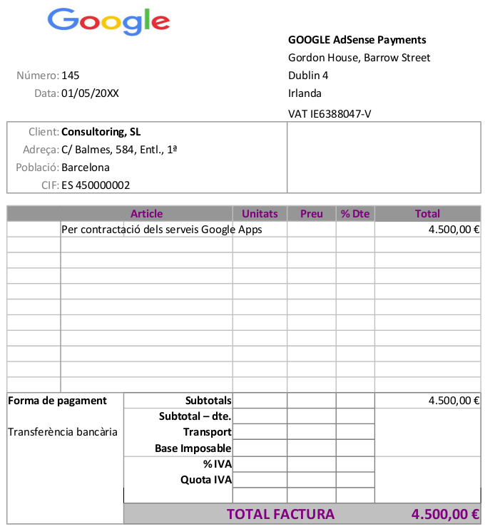 A continuació Consultoring, SL rebrà la factura de Google que podeu veure a la figura: