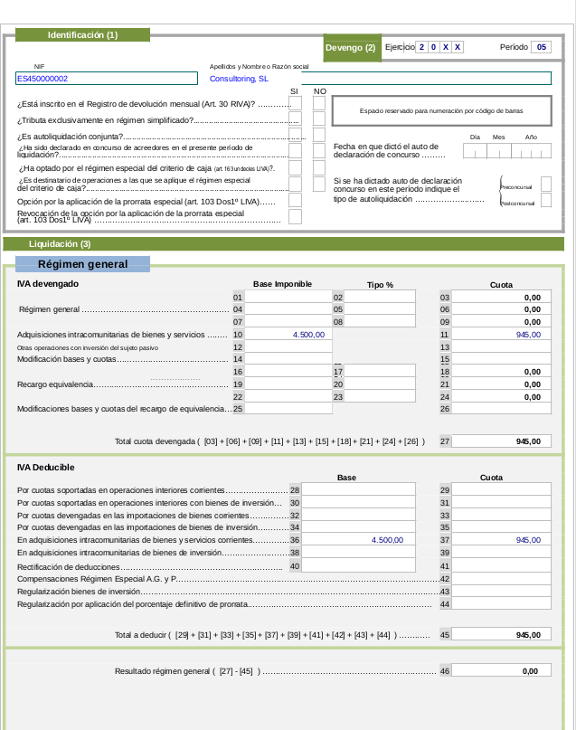 Per tant, Consultoring, SL haurà de declarar l’IVA corresponent a la prestació de serveis al Model 303 i repercutir i suportar l’IVA corresponent (21%), a la mateixa declaració. A l’apartat d’IVA meritat, declararà la base imposable de les adquisicions intracomunitàries (4.500 €) i la quota corresponent (945 €) i, a l’apartat d’IVA deduïble, tornarà a declarar la base imposable (4.500 €) i la quota d’aquestes adquisicions (945 €).
