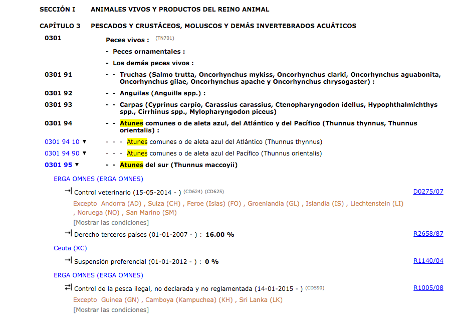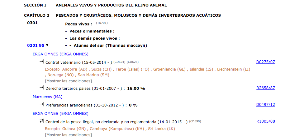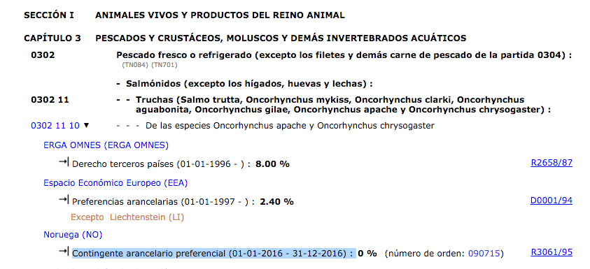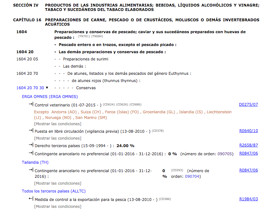 Com podeu veure a la figura, si cerquem la mercaderia amb codi 1604.20.70.30 amb origen Tailàndia, veiem que té dos contingents, un exclusiu per Tailàndia i un altre per a tots els paisos.