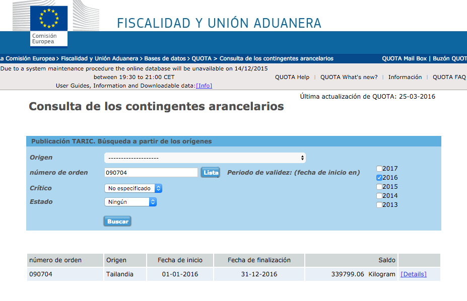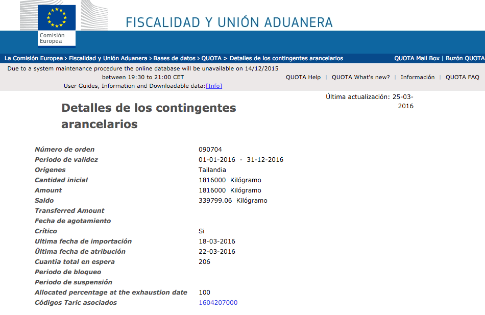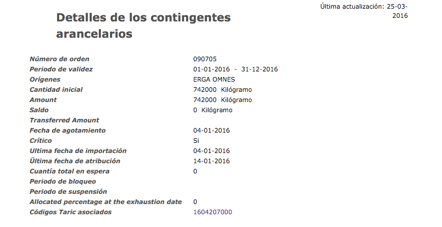 En aquesta pàgina es poden consultar les dades principals, com ara les dates d’aplicació, el saldo inicial i el saldo actual en la data de consulta, etc. Cal prestar atenció a la quantitat indicada com a quantitat total en espera. Aquesta quantitat total en espera és l’import total de sol·licituds que han estat remeses pels estats membres de la Unió Europea a la Comissió, per a un contingent duaner concret, però que encara no s’ha procedit a la seva col·locació. És a dir, és una quantitat que ja s’ha sol·licitat però que encara no s’ha repartit i que, a efectes pràctics, cal restar del saldo actual per obtenir el saldo més proper al real.