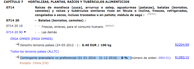 Per veure l’avantatge aranzelari que suposa acollir-se a l’aranzel cal fer una cerca al TARIC. Tornem a fixar-nos en la figura on podem veure que aquesta mercaderia si fos d’origen tailandès pagaria els drets a tercers. Per tant, fora del contingent pagaria un 24%.