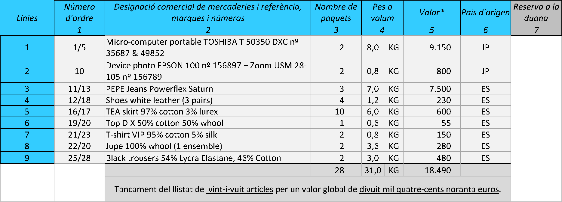 A la figura podeu veure un exemple de llistat de mercaderies que s’han inclòs en un quadern ATA, amb tota la informació que s’ha de facilitar sobre paquets, pes, valor i país d’origen.