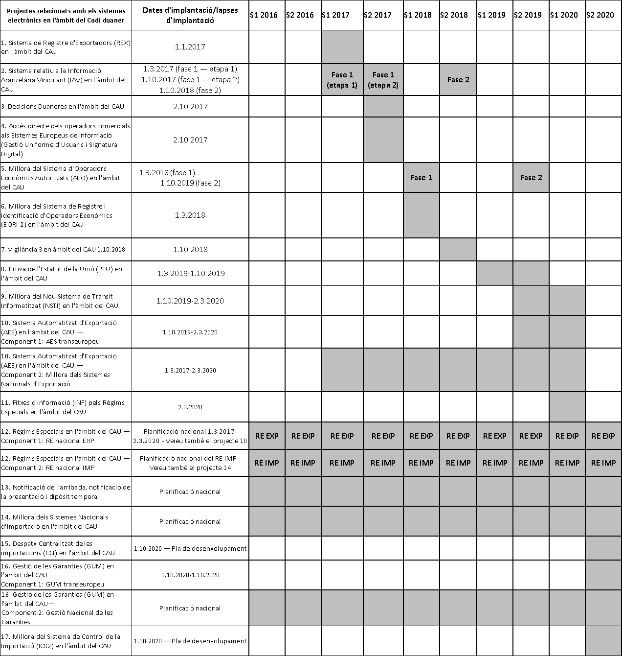 Calendari d'entrada en funcionament de les decisions del CAU