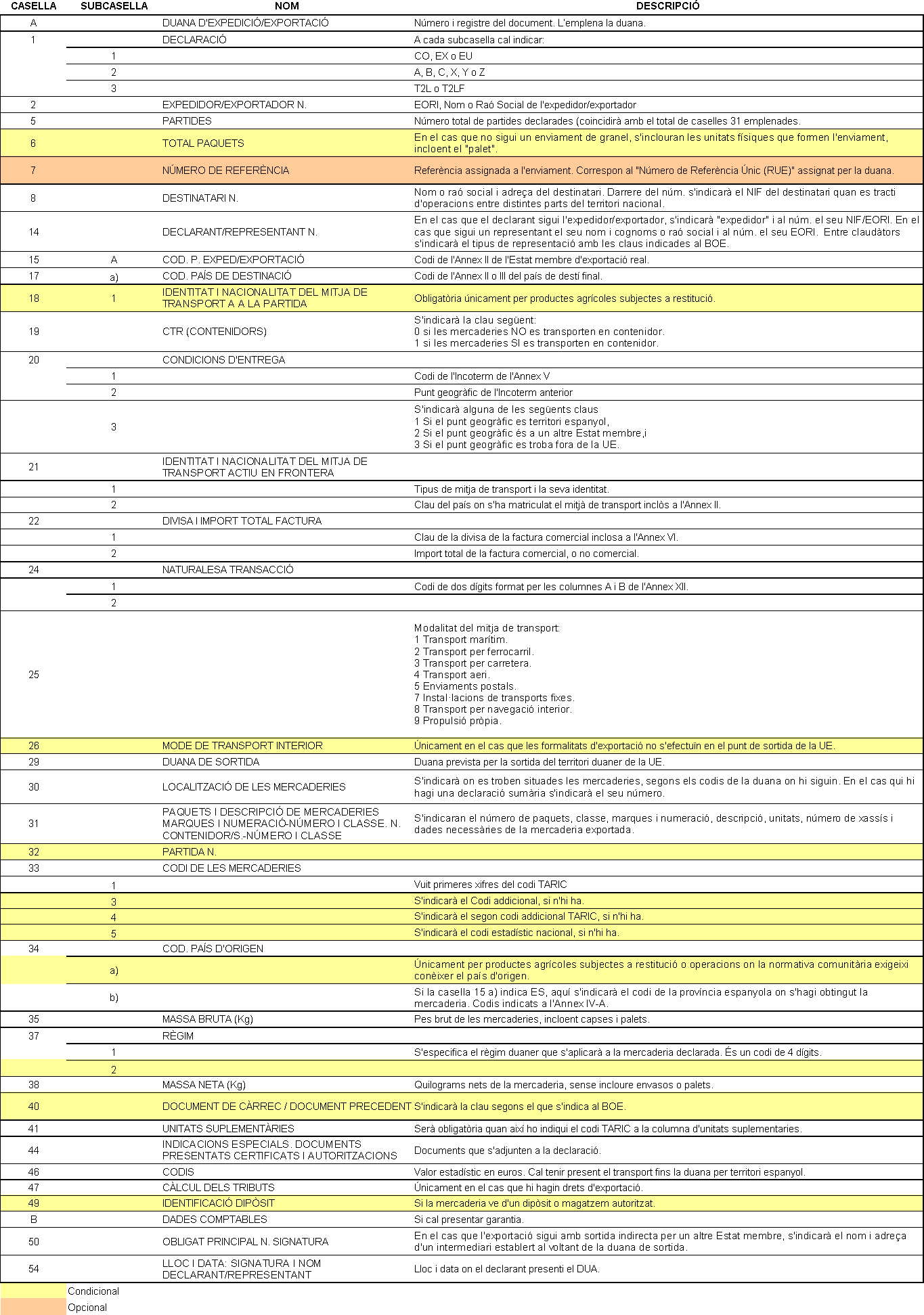 Podeu veure el detall de les caselles obligatòries, condicionals i opcionals del DUA d’exportació a la Figura 22:
