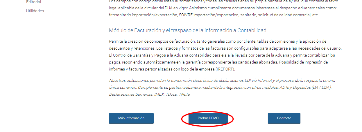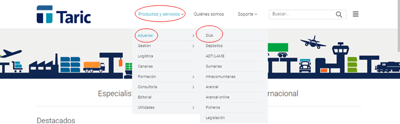 Trobareu la versió demostrativa del programa TARIC, per emplenar i presentar el DUA davant de la duana, al web de l’empresa, a l’apartat Productes i serveis, seguint el camí Duanes/DUA, tal com mostra la figura.