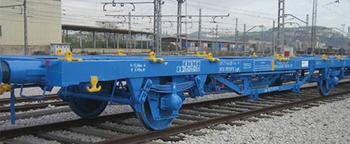 - Mercaderia en contenidors. La flexibilitat i la garantia que ofereix en el transport de mercaderies en contenidors consolida el ferrocarril com una baula indispensable en les cadenes logístiques eficients. Es poden transportar contenidors de 20’, 30’, 40’, 45’ o equivalents homologats. Els contenidors es transporten en vagons, tipus plataforma (Figura figura). Podeu consultar la flota de vagons de RENFE Mercancías per al transport de contenidors en Mercaderia en contenidors.