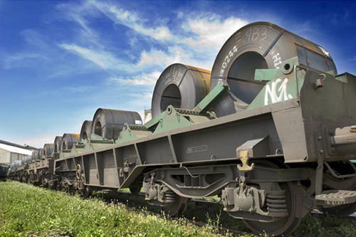 - Siderúrgics, com bobines d’acer que es transporten en vagons oberts (Figura figura) o tancats porta bobines, o en vagons tancats de pis pla, sobre palets. També s’inclouen en aquesta categoria els coneguts com a productes llargs, com perfils, vareta ondulada, xapa, fil de màquina i carrils, i altres elements utilitzats en el sector de la construcció, que es transporten en plataformes específiques per a aquest tipus de producte (Figura figura). Altres productes com la ferralla es transporten en vagons oberts protegits amb xarxa de seguretat.