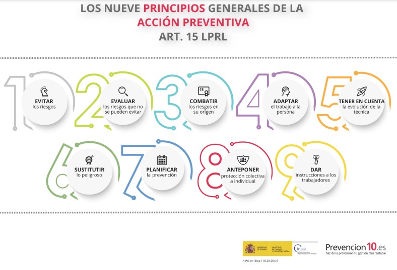Els principis preventius són el fonament de la gestió PRL en qualsevol empresa. Per això, els nou essencials són destacats en el cartell de PREVEN10, com es veu en la figura: