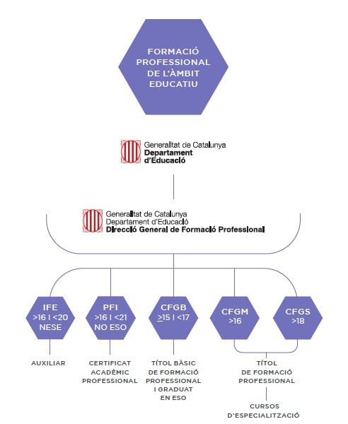L’educació formal acadèmica reglada i professionalizadora comença a l’educació secundària obligatòria (ESO) i continua al batxillerat, atès que en aquests nivells ja es cursen matèries de diverses àrees de coneixement, competències bàsiques de qualsevol professió. Ara bé, en general, quan es pensa en una professió tothom es fixa en els estudis tècnics dels cicles formatius o bé en els estudis universitaris, però n’hi ha més. De fet, les principals vies acadèmiques per accedir a una professió són els que mostra la figura, i són:
