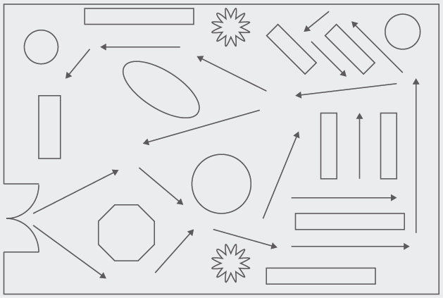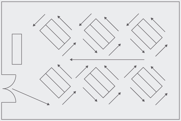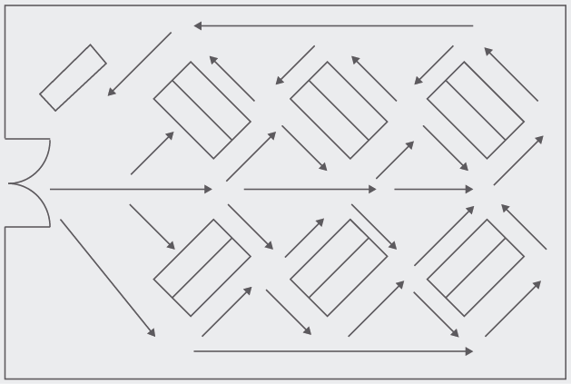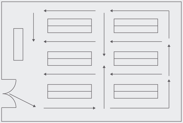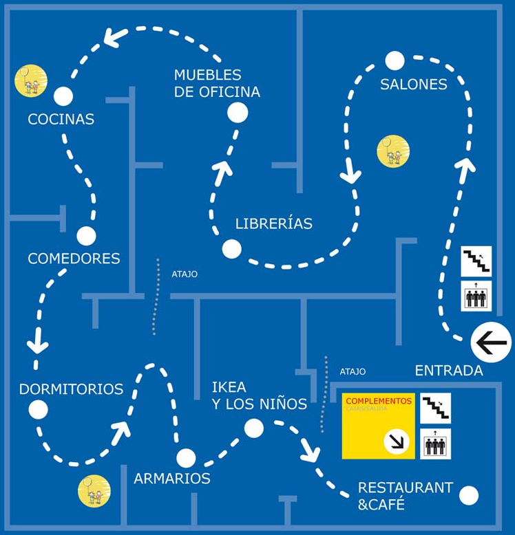 - Disseny d’una ruta programada. S’ha de decidir prèviament la ruta que es vol que segueixin els clients, procurant que passin per totes les seccions més importants. Per això és recomanable dissenyar una ruta lleugerament forçada, per fomentar que els clients tinguin la sensació que són ells mateixos qui decideixen com i quan recorren els passadissos.