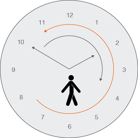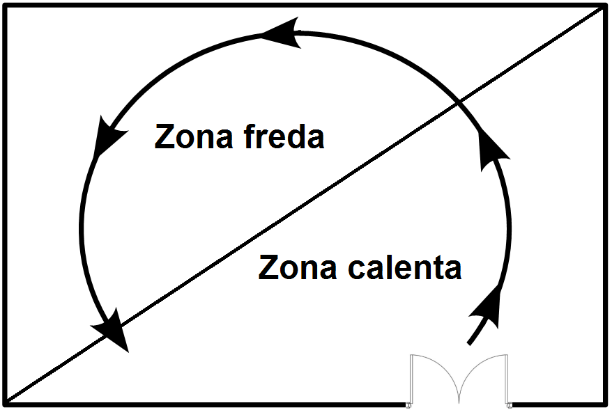 - En els establiments de lliure servei, la porta s’ha d’ubicar al centre o a la dreta de l’aparador. Això afavoreix la circulació natural de la clientela i assegura que el client realitzi el màxim recorregut possible per la superfície de vendes, ja que la tendència natural és caminar en sentit contrari a les busques del rellotge.