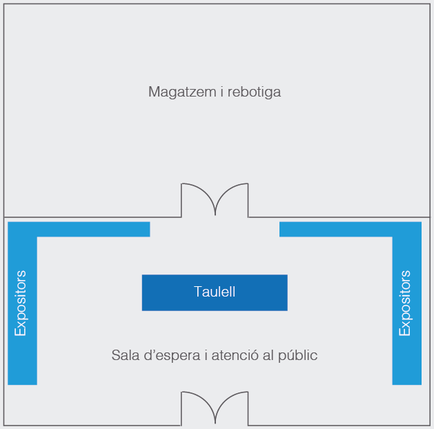 - En els establiments de venda personal o tradicional, la porta s’ha d’ubicar a l’esquerra o al centre de la façana, de manera que el taulell quedi ubicat al fons o a la dreta de l’establiment.