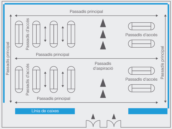 - Els passadissos han d’estar sempre lliures d’obstacles i correctament senyalitzats per facilitar la circulació.