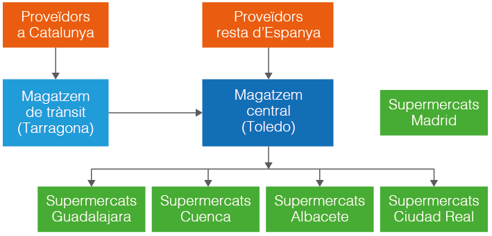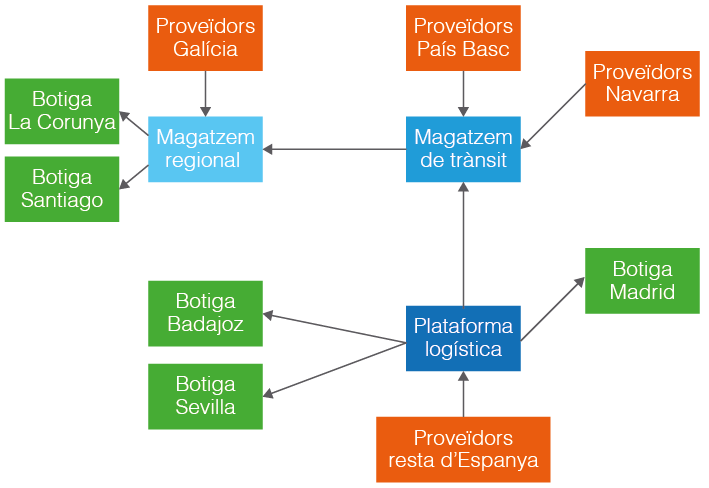 - Totes les botigues, a excepció de les situades a Galícia, fan comandes únicament a un gran magatzem que l’empresa ha construït a Madrid. La seva finalitat és fer comandes més grans per aconseguir preus més baixos dels proveïdors. Aquests proveïdors subministren directament a aquest magatzem i des d’aquest distribueix la mercaderia a les botigues.