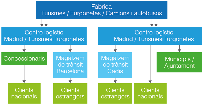 Una empresa automobilística fabrica turismes, furgonetes, camions i autobusos (per a transport municipal). El centre de producció és a Madrid. Els turismes i les furgonetes passen des de la fàbrica al centre logístic ubicat a Madrid. Els vehicles que es destinen al mercat nacional es distribueixen a través de concessionaris, i per als que es destinen a l’exportació s’ha creat un magatzem a Barcelona.
