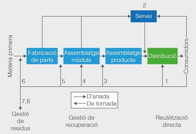 - Reprocessament: se separa el producte en els seus components per restaurar-los i tornar-los a ajuntar com si es tractés d’un producte nou.