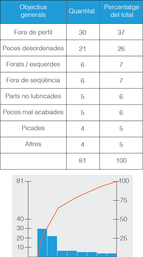Vegeu a la figura un diagrama de Pareto que mostra els defectes en elements estructurals trobats al llarg de la fabricació que provoquen el rebuig del producte final.
