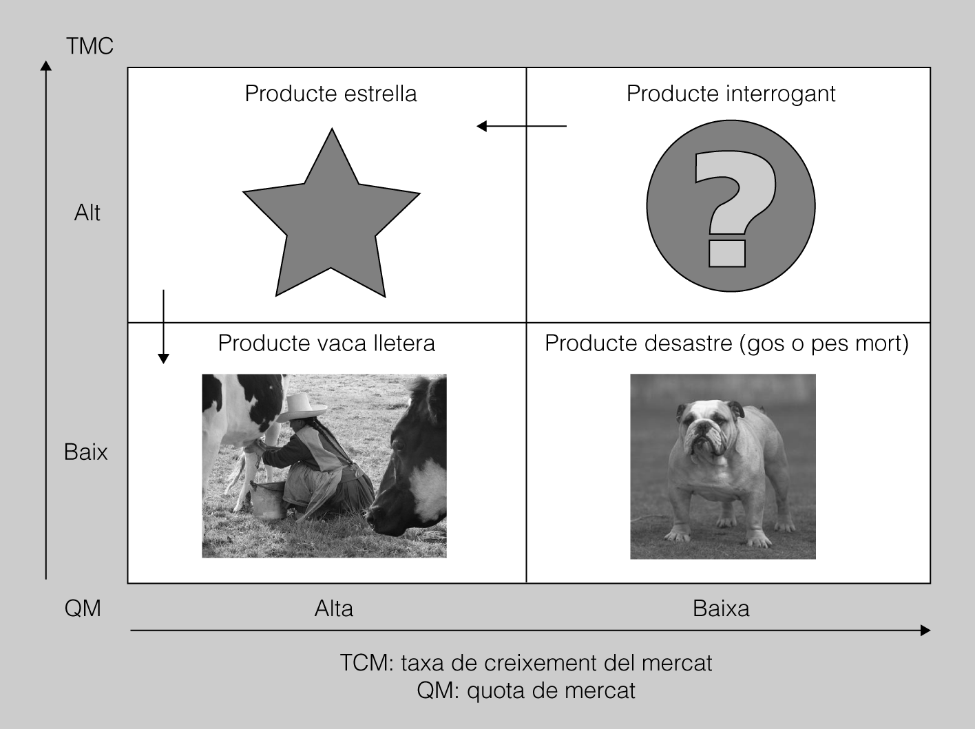 Així, podeu veure que en la part superior de l’eix vertical es representen els productes (A i B), que agraden més a les dones madures i conservadores; en canvi, en la part inferior del mateix eix es representen els productes que agraden més a la gent més jove i transgressora (C i D).