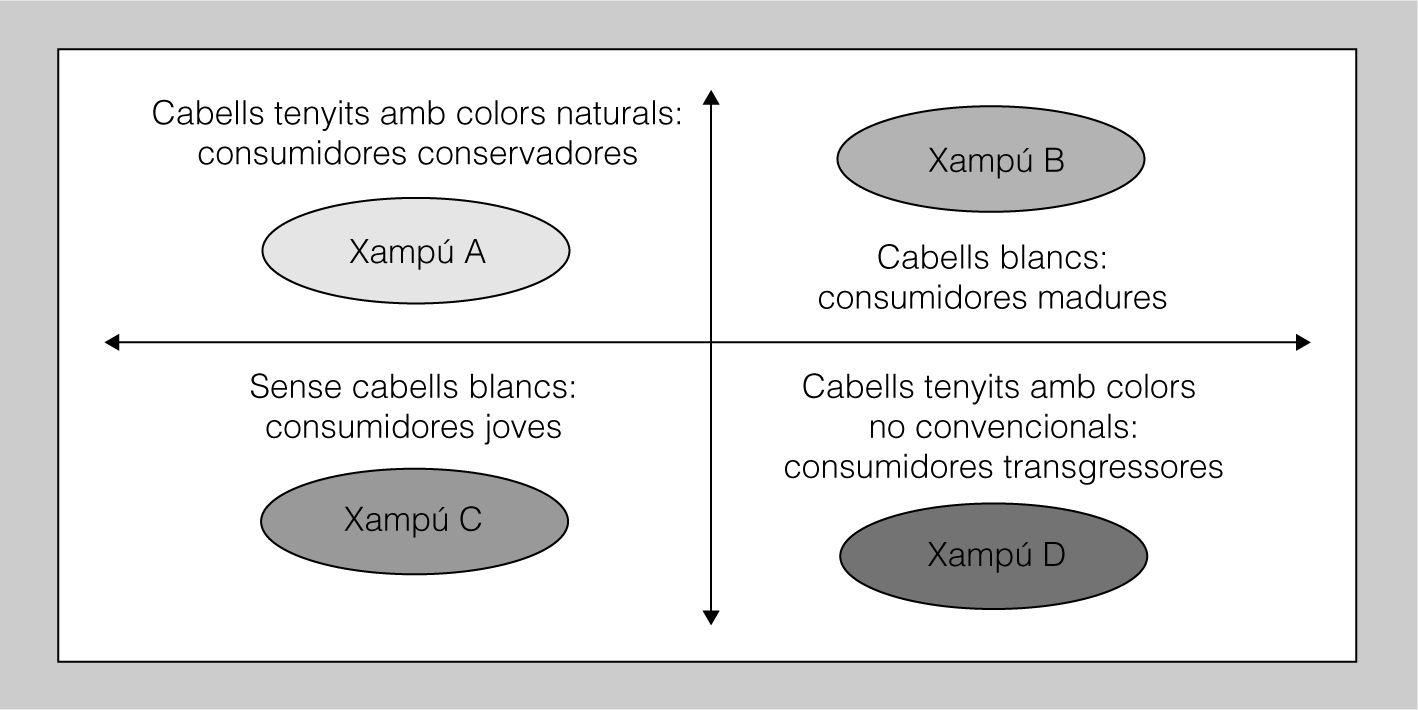 En la figura podeu observar un exemple de mapa de posicionament en el qual es representen quatre productes similars, en aquest cas xampú, de marques diferents que estan posicionades segons les percepcions que en tenen els consumidors.