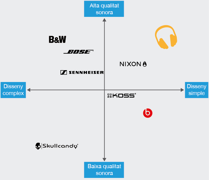 Suposem que, després d’un estudi fet a partir d’enquestes, els criteris més anomenats com a factors decisius per a la compra d’uns auriculars són la qualitat del so i el disseny modern. Amb aquesta informació es podria dibuixar un mapa de posicionament amb un eix horitzontal que recollís el disseny (simple enfront de complex) i un eix vertical que recollís la qualitat del so (alta enfront de baixa). La figura mostra com podria ser aquest mapa de posicionament.