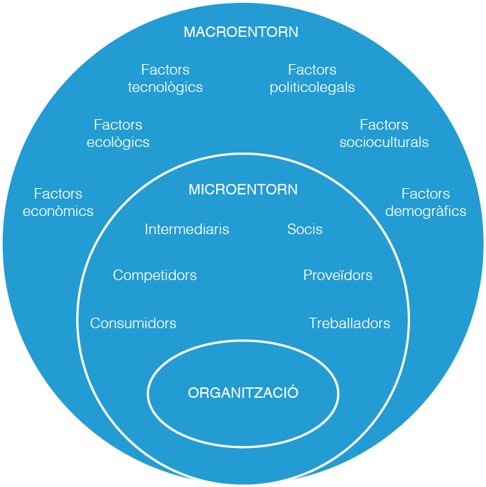 Els factors del macroentorn poden influir en les decisions i els resultats de l’organització. Entre aquests es poden destacar els factors legals, polítics, econòmics, tecnològics, ecològics, demogràfics, socials i culturals que envolten els diferents sectors de l’economia. Són factors que l’empresa no pot controlar, però que exerceixen una influència significativa per assolir l’èxit de l’estratègia empresarial. És important identificar aquests factors per tal d’intentar aprofitar les oportunitats i preveure possibles amenaces.