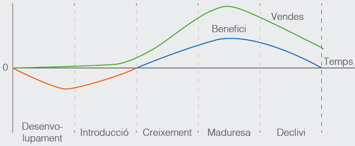La gràfica del cicle de vida d’un producte (vegeu figura) mostra la freqüència de vendes d’un producte al llarg de la seva vida. L’eix de coordenades Y representa les vendes i beneficis i l’eix X representa les etapes del producte al llarg del temps.