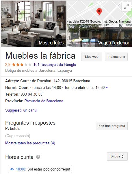 En cas que l’empresa anunciant sigui un lloc físic, AdWords Express ofereix el servei de Google My Business (vegeu www.google.com/business). Aquest servei té en compte les ressenyes per determinar en el posicionament (vegeu la figura).