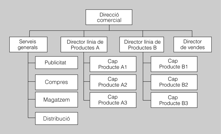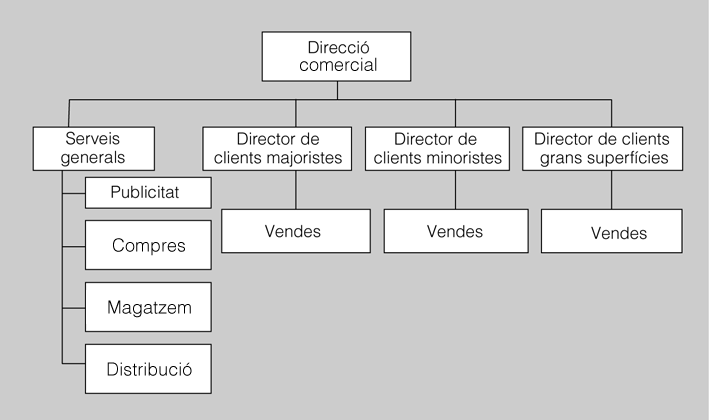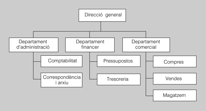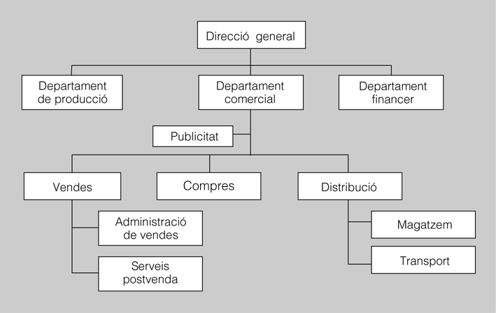 La figura mostra l’organigrama d’una empresa comercial amb tres departaments.