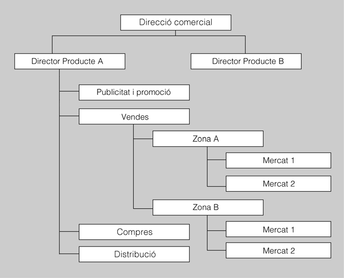 - Model d’organització divisional. L’estructura divisional sorgeix com a conseqüència de la diversificació de productes i del propi creixement de l’empresa. Consisteix a agrupar unitats seguint diferents criteris, com ara les zones geogràfiques o les línies de productes. Per exemple, les empreses multinacionals que tenen la casa matriu en un únic país, però que després tenen una filial que reprodueix l’estructura d’una empresa independent amb els seus propis departaments. La figura mostra una organització per productes d’un departament comercial i la figura mostra una organització per clients.