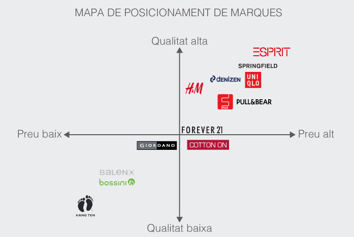 La figura mostra un mapa de posicionament per al sector de la moda i confecció sobre la base dels atributs de preu i qualitat.